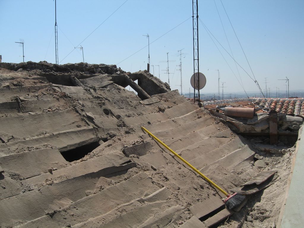 Al levantar la teja de esta cubierta de mas de 200 años encontramos bajo varios centímetros de arena (el antiguo mortero disgragado) la tabla de ripia . Esta tabla no sirve, como afirman algunos, para impermeabilizar la cubierta, ya que el solape entre ellas es a la inversa de el de la teja y dejaría pasar el agua como se ve en la foto. Esta clavada a los pares y su función es servir de soporte a la teja e impedir que esta y el mortero bastardo de cal que la sujeta se desplace hacia abajo por gravedad. Actualmente se sustituyen por tablero hidrófugo y onduline, pero esa será otra entrada.