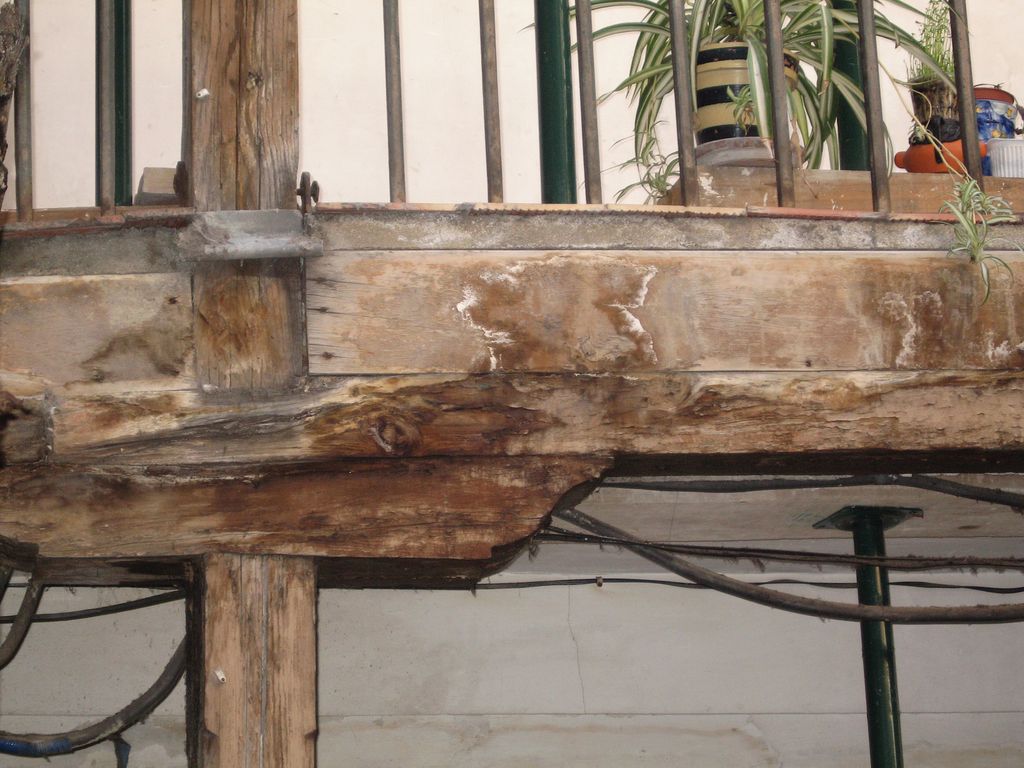 El agua, al filtrarse en el forjado del corredor, ha provocado la pudrición de las cabezas de las viguetas que, en algunos casos, han acabado haciendo de cuña y desplazando las carreras sobre las que se apoyaban al interior del patio, perdiendo así la vertical que casi causa el colapso de la estructura.