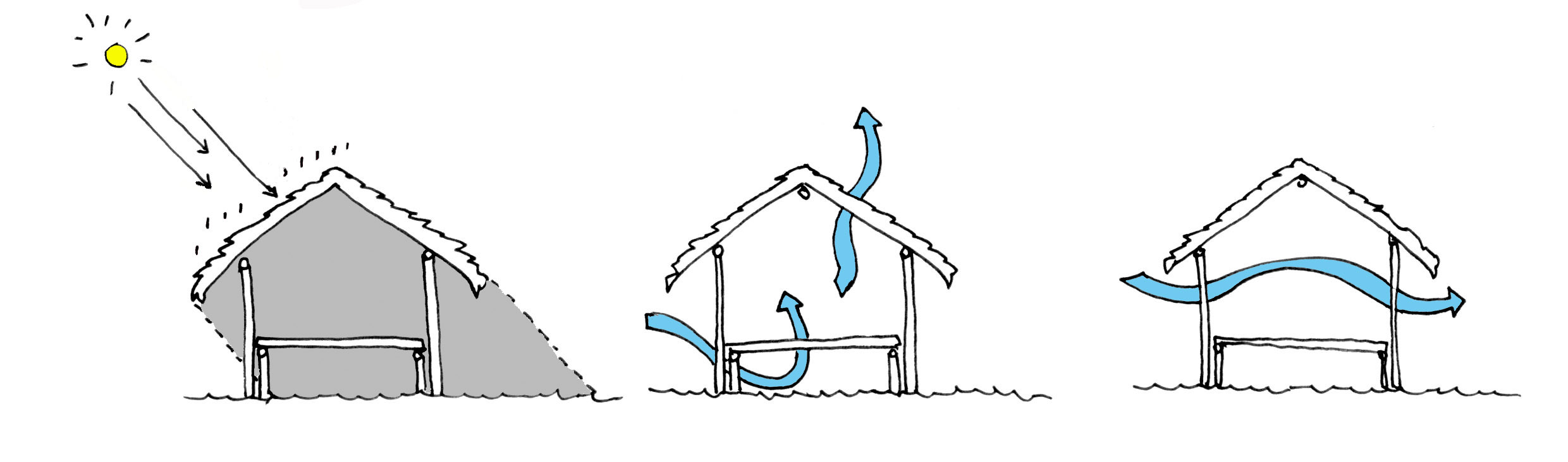 Máxima ventilación: La ausencia de paredes, la altura del techo y la situación respecto a los vientos  están pensados para premitir la máxima ventilación con el fin de enfriar la construcción y eliminar la humedad, a esto hay que sumarle el suelo de troncos de manaca que también permite el paso de aire fresco en contacto con el río y la cubierta auto ventilada.