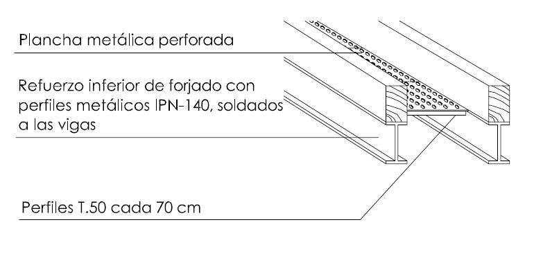 En este detalle donde se describe la subestructura de refuerzo se ha incluido una lámina metálica perforada reforzada con perfiles en T que sujeta el entrevigado y evita posibles desprendimientos.