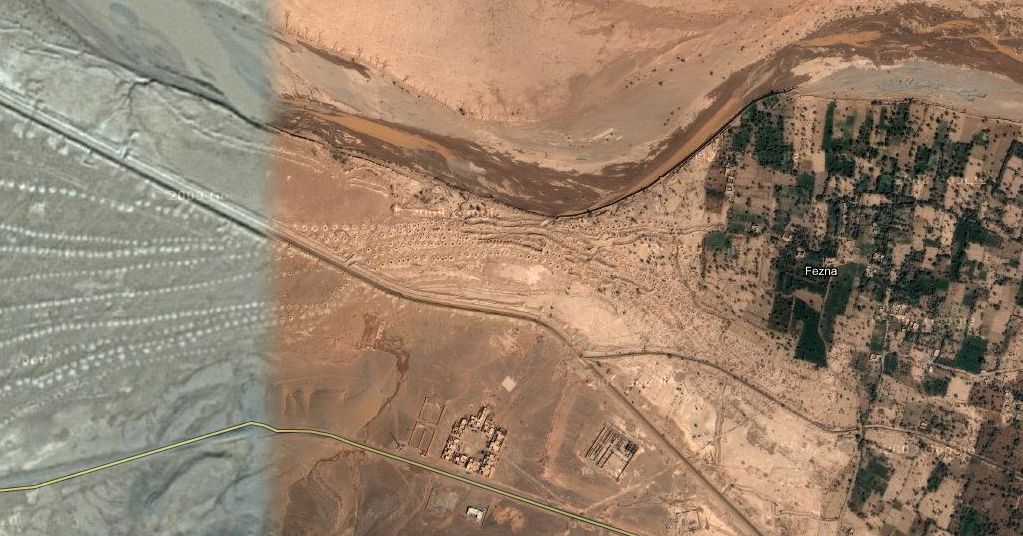 Campamento bereber asentado junto al sistema de pozos artesanales que siguen durante kilómetros las líneas del acuífero subterráneo que suministra agua al oasis de Fezna en el sur de Marruecos.