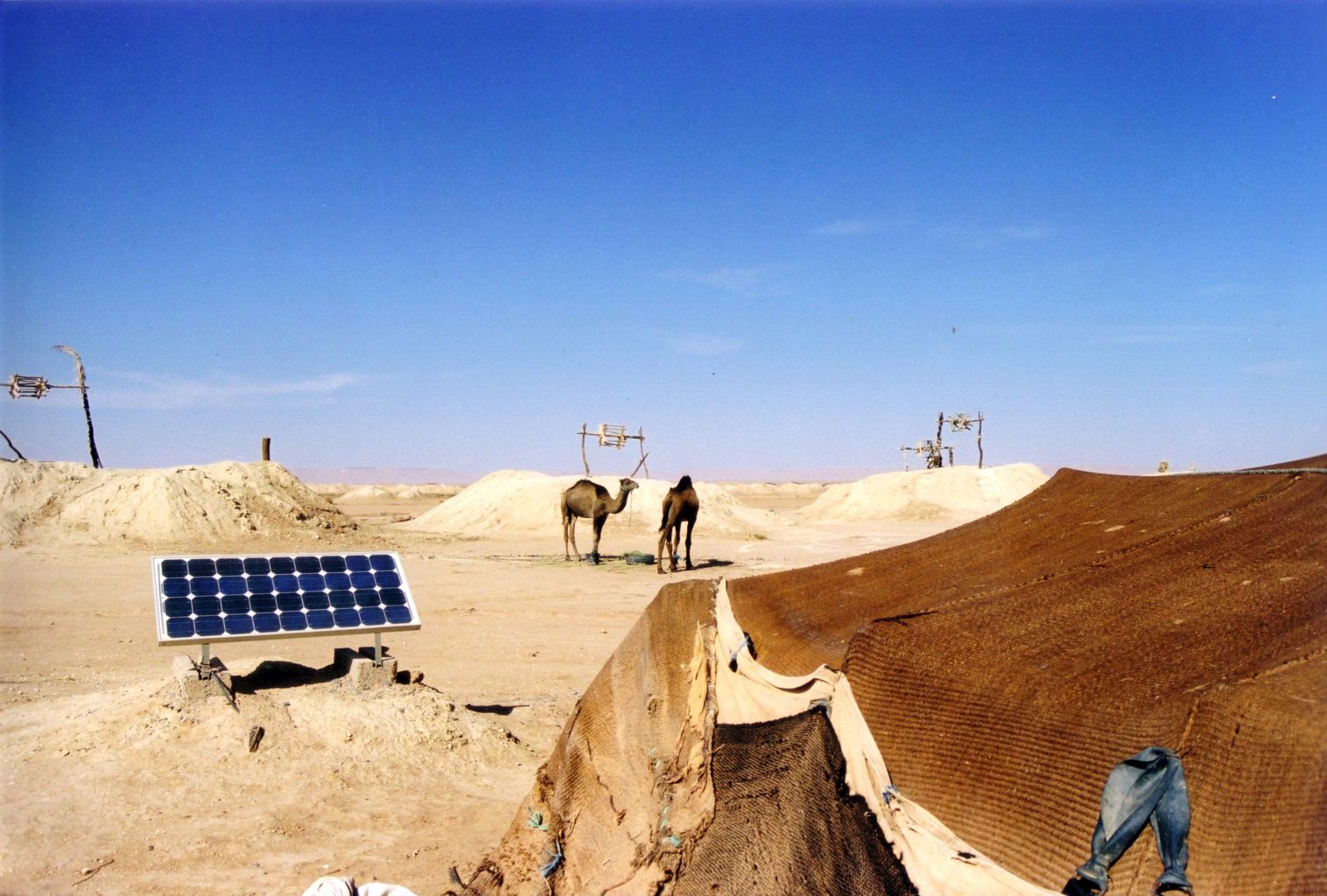 No le falta detalle: Tienda transportable adaptada al medio fabricada a partir de materiales autóctonos y biodegradables, medio de locomoción animal de bajo consumo, abastecimiento de agua mediante pozo manual y placa fotovoltaica conectada a batería para consumo eléctrico.