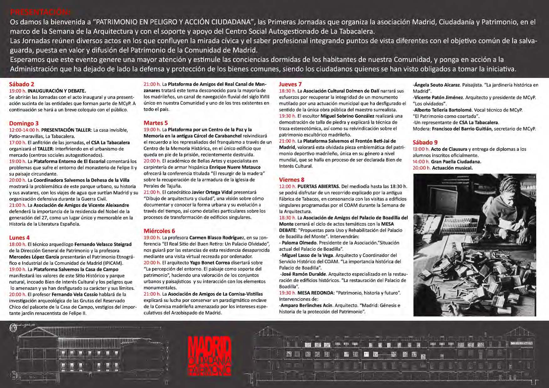 En estas primeras Jornadas de Madrid, Patrimonio y Ciudadanía, podremos ver y oír experiencias en defensa ciudadana que van desde salvar joyas arquitectónicas como Beti Jai, a defender el Parque de la Cornisa o la Dehesa de la Villa.