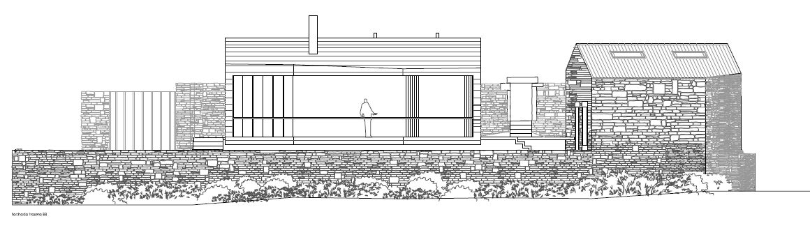Una de las soluciones que adoptamos del modelo tradicional fue la compacidad, renunciando a la segunda planta que permite la normativa, con el fin de proteger la edificación de los vientos y producir un impacto mínimo en el entorno, quedando los ventanales retranqueados tras un soportal y cerrado este a su vez por paneles móviles acabados con piedra del lugar.