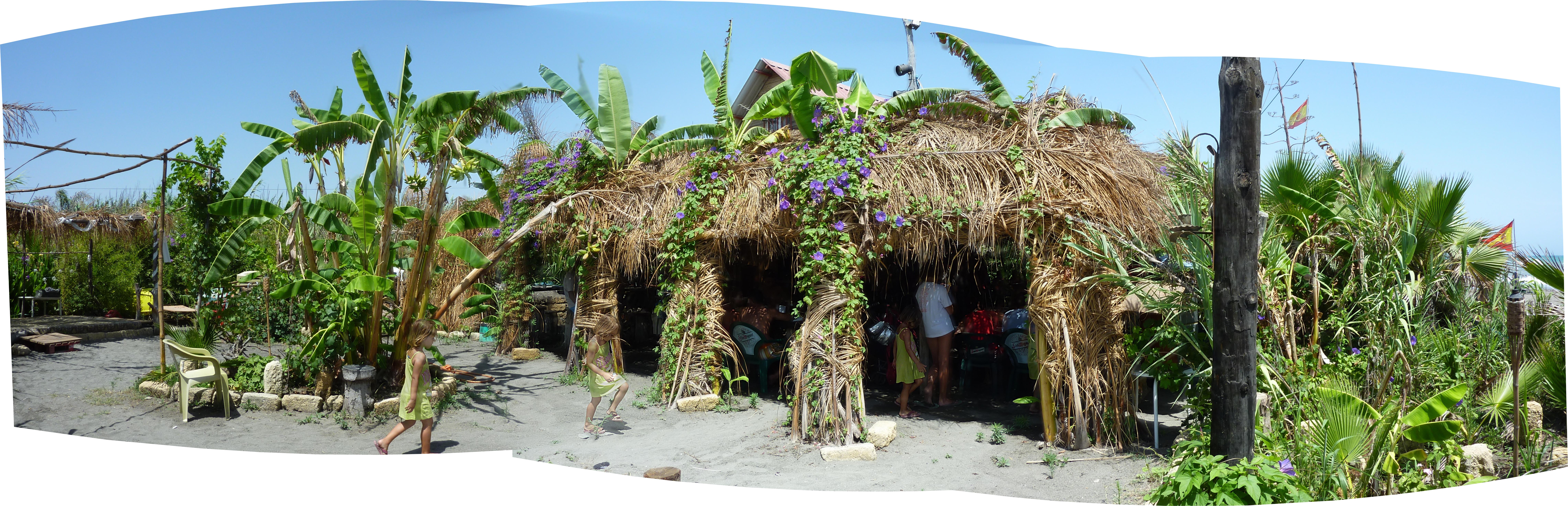 En esta serie de entradas estamos describiendo algunos  métodos de acondicionamiento y refrigeración mediante sistemas naturales que se utilizan en la arquitectura popular de la provincia de Málaga. Hemos visto el uso de pantallas vegetales y como estas se extienden y amplían creando un espacio habitable  frente a la fachada sur de la vivenda. Lo que presentamos ahora es el paso siguiente, es decir, el porche independizado de la vivienda y convertido en establecimiento temporal de abastecimiento estival playero: EL Chiringuito.