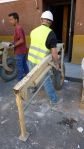 Empezamos la consolidación de un edificio centenario en el Pardo con la llegada de la caballería. Esta construcción catalogada de muros de ladrillo tosco con entramado de madera tiene problemas de lavado de cimentación a causa de repetidas fugas en la red de saneamiento. El equipo de micropilotaje está realizando las inyecciones de hormigón para mejorar de la capacidad portante del suelo mediante una perforadora desmontable que nos permite trabajar en el interior de la vivienda.