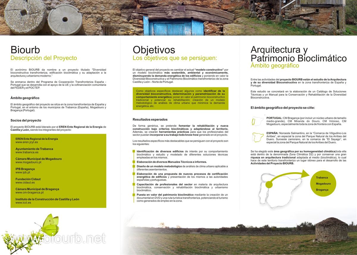 El objetivo general del proyecto es cambiar el actual “modelo constructivo” por un modelo bioclimático más sostenible, ambiental y económicamente, disminuyendo la demanda energética de los edificios y poniendo en valor la Diversidad Bioconstructiva y el Patrimonio Bioclimático transfronterizo de la zona Castilla y León – Norte de Portugal.