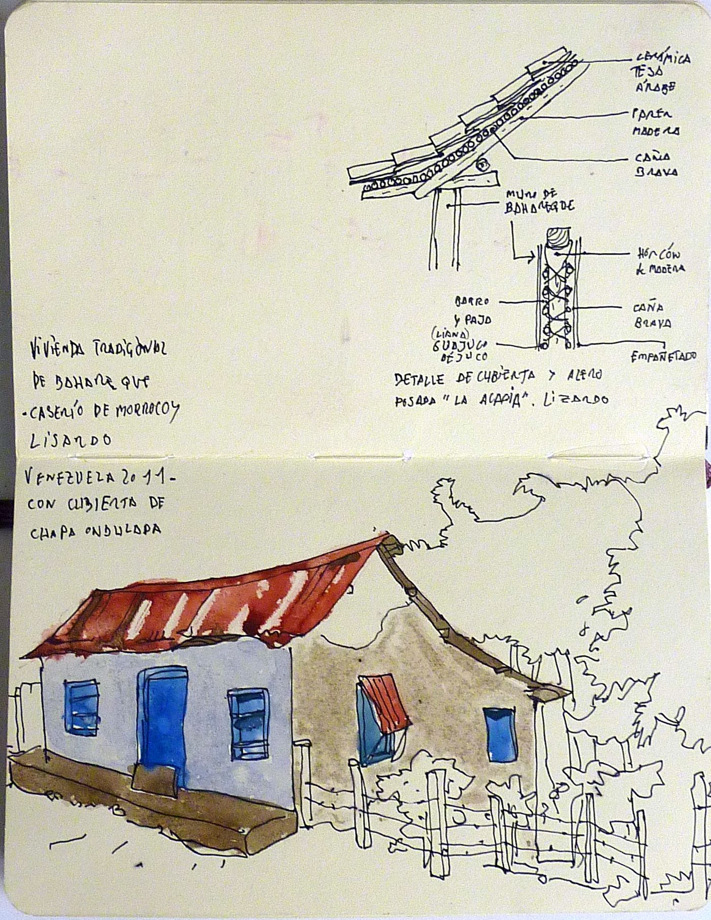 El boceto reproduce una vivienda de bahareque pintada con los colores pastel propios del Caribe, escogidos en esos tonos para evitar el deslumbramiento en los días de radiación solar intensa. El techo en este caso ha sido sustituido por uno de chapa con lo que el sobrecalentamiento en el interior está asegurado. El detalle de la cubierta representado está tomado de otra casa en la misma calle que ha sido restaurada como posada, conservando los sistemas y materiales autóctonos: Madera, caña, lianas, barro y cal.