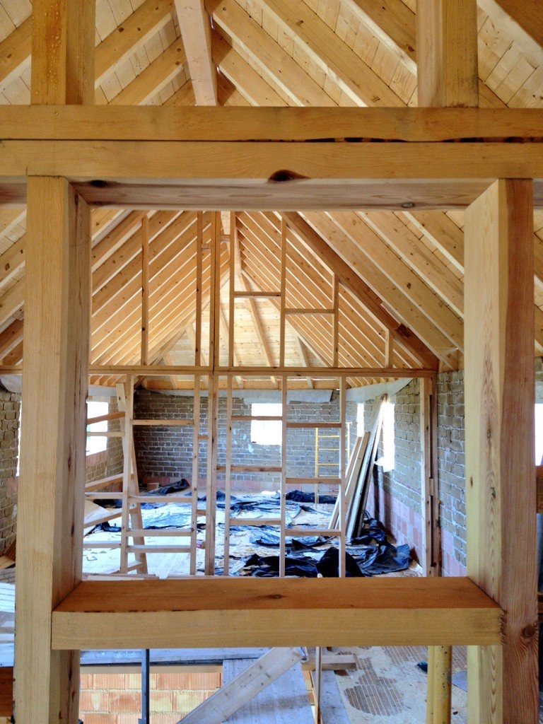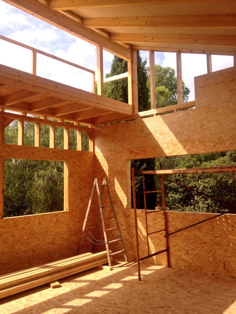 Estructuras de madera y tableros de madera reciclada.