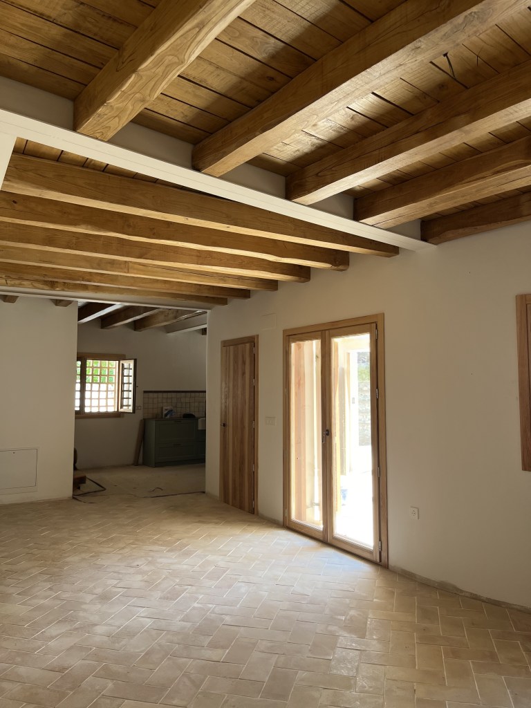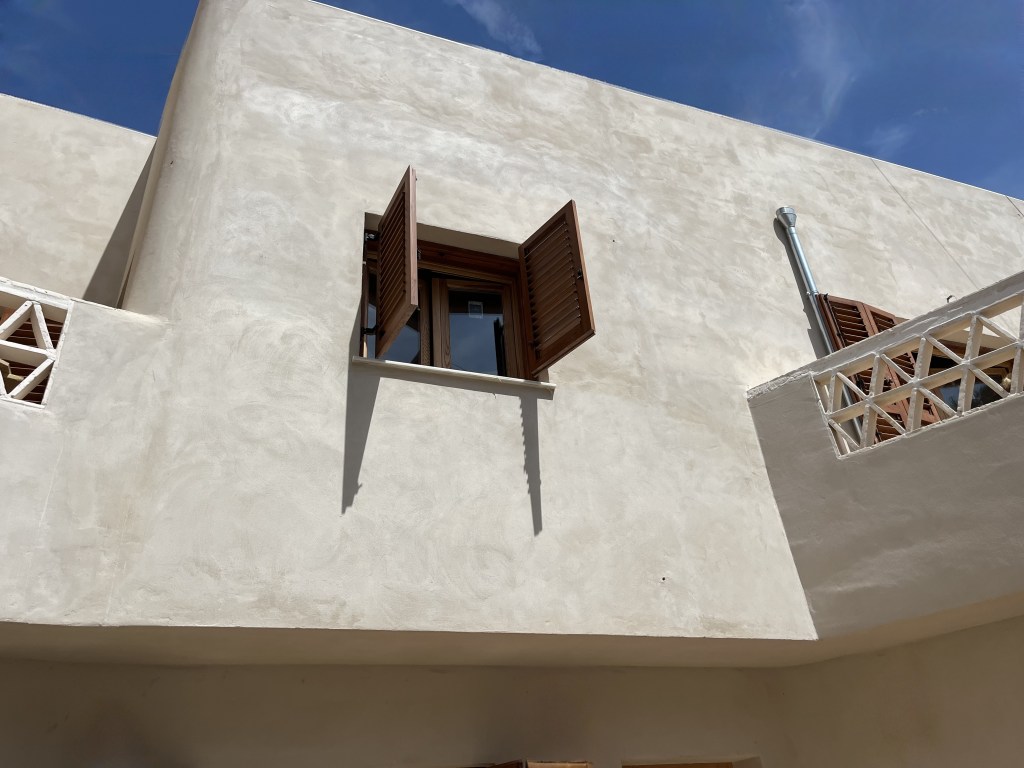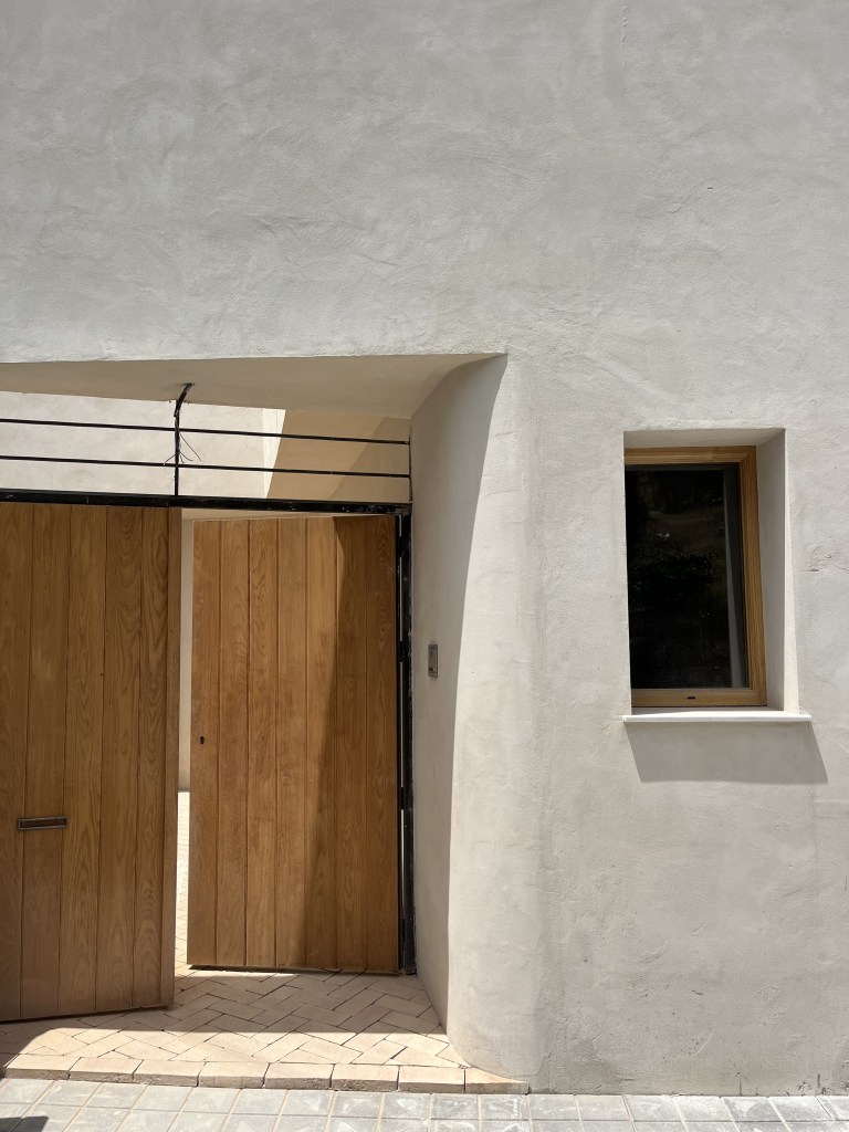 Para los interiores, empleamos yeso natural, por su capacidad para regular la humedad, su resistencia al fuego y su durabilidad. El trabajo fue dirigido por Andrés, un maestro yesaire de Motril con más de 30 años de experiencia, verdadero guardián de un saber artesanal que merece ser preservado. La cueva se restauró con cal aérea de hornos tradicionales de madera de olivo en Morón de la Frontera.
