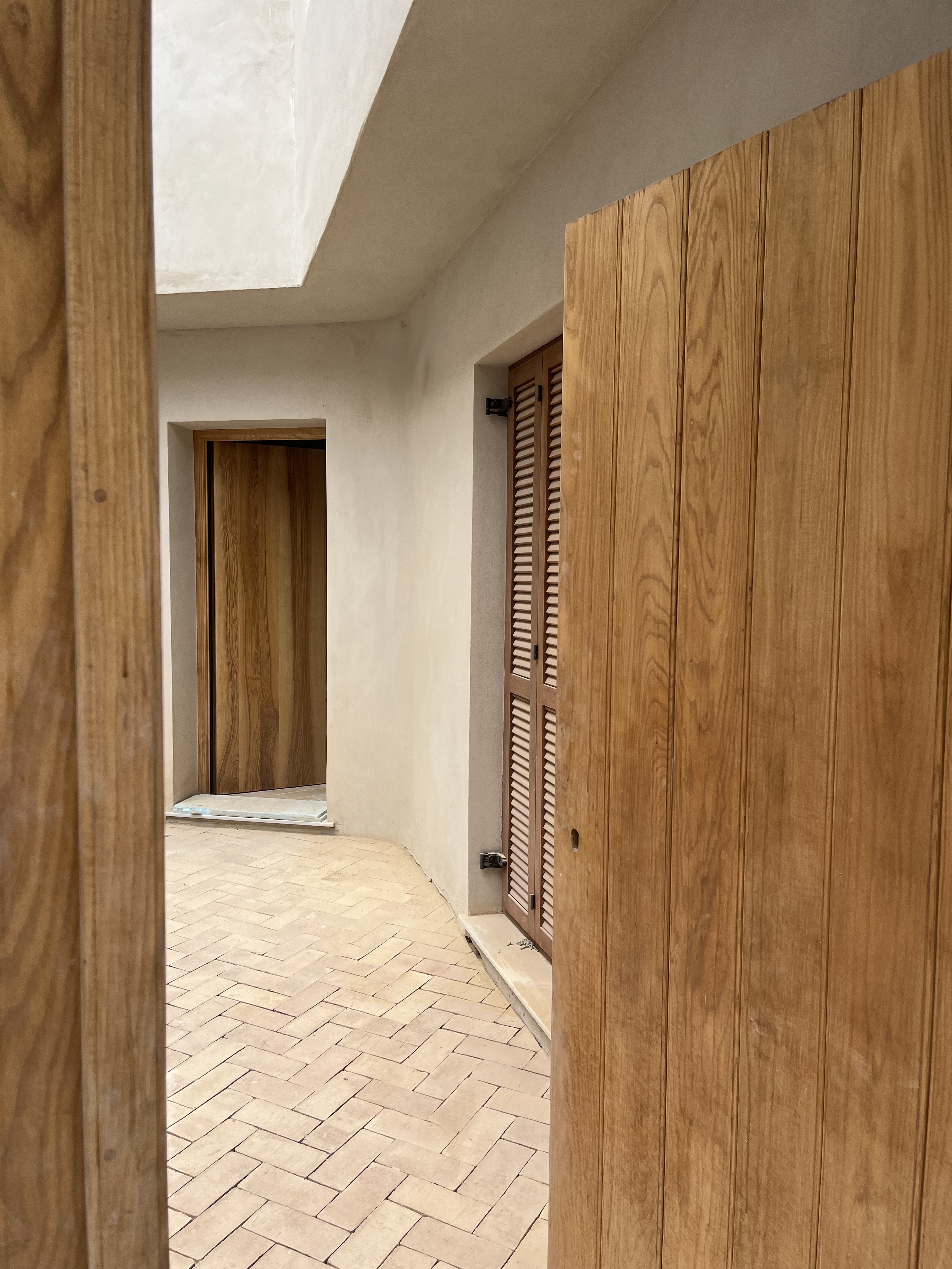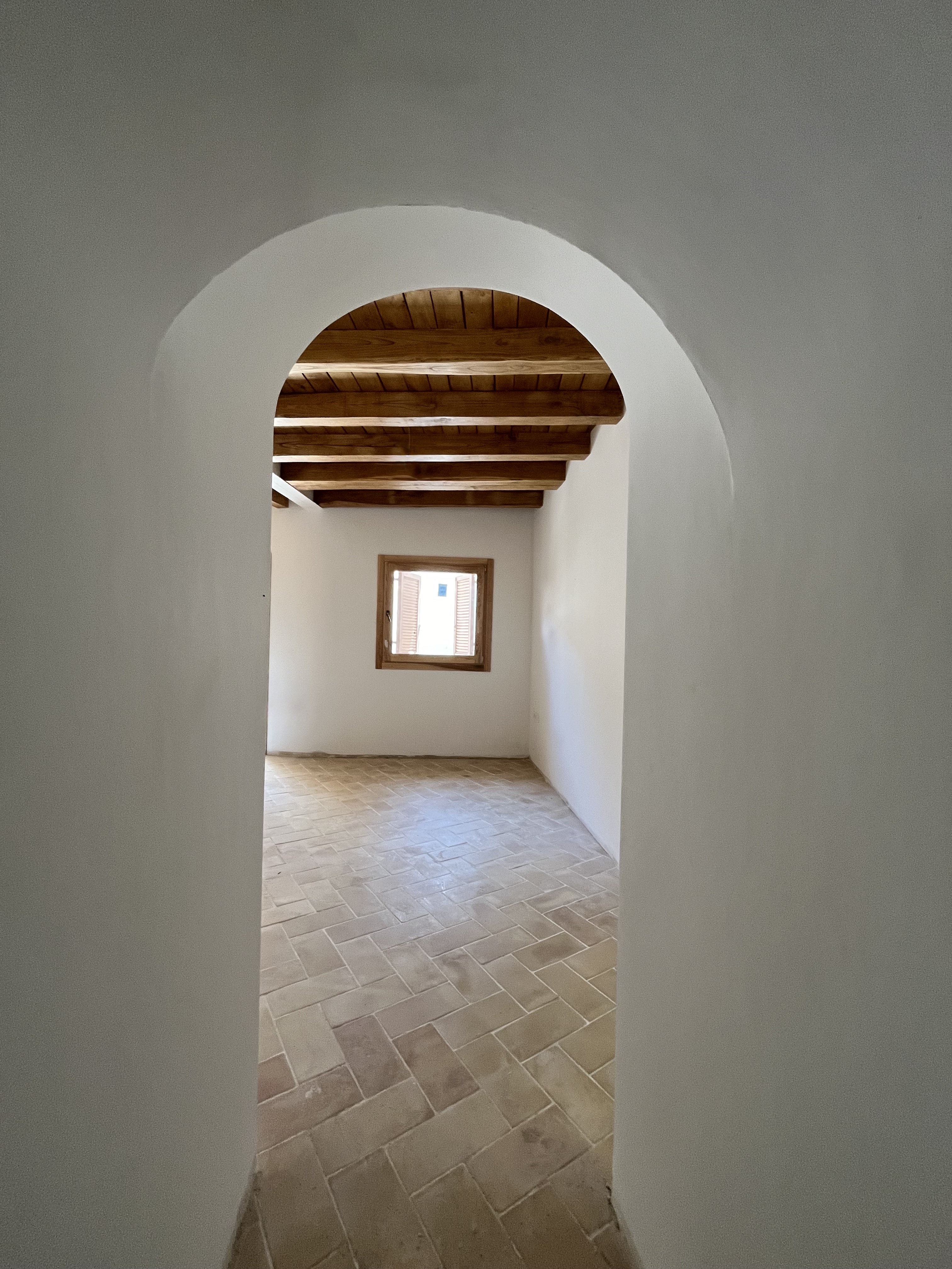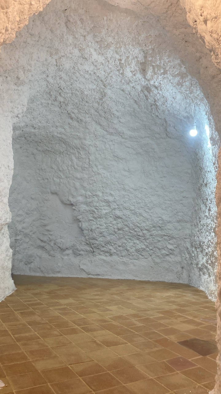 Para los interiores, empleamos yeso natural, por su capacidad para regular la humedad, su resistencia al fuego y su durabilidad. El trabajo fue dirigido por Andrés, un maestro yesaire de Motril con más de 30 años de experiencia, verdadero guardián de un saber artesanal que merece ser preservado. La cueva se restauró con cal aérea de hornos tradicionales de madera de olivo en Morón de la Frontera.